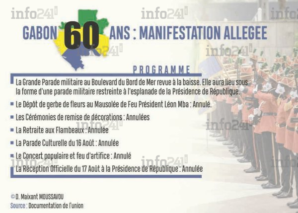 Ce n’est pas seule tradition qui a été supprimée cette année par la présidence gabonaise, en raison de la pandémie de coronavirus qui est pourtant en forte baisse. Seront toutes aussi victimes d’annulation en série de cette fête allégée : la remise des décorations, la retraite aux flambeaux, la parade culturelle, le concert populaire et le feu d’artifice, et enfin, la réception officielle à la présidence gabonaise.