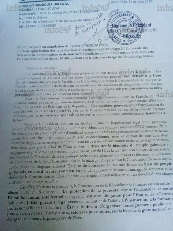 Observant l’article 85, alinéa 3 qui dispose que « le recours suspend le délai de promulgation de la loi ou l’application de l’acte », l’ONG a dans un communiqué de presse parvenu à Info241, rappelle que « depuis le 31 octobre 2017 à 13h40, les étudiants du Gabon, selon la loi, sont invités à ne payer tout montant supérieur à 9.000 FCFA, les Chefs d’Etablissements ont l’obligation de suspendre leurs décisions d’augmentation, en attendant la décision de la cours sensée être rendue plus tard le 30 novembre 2017 ».