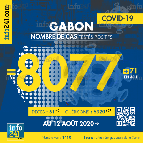 Ce qui porte le bilan à 8 077 cas confirmés, 51 décès et 5 920 guérisons. Le Gabon compte actuellement 2 106 cas actifs de la pandémie officiellement déclarés. Parmi eux 29(-15) patients hospitalisés dans le pays dont 0(-9) en réanimation.