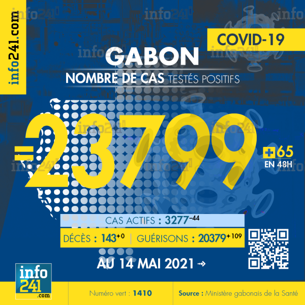 Bilan épidémiologique du Gabon au 14 mai 2021 : 65 nouveaux cas enregistrés en 48h dans l’Estuaire (41 cas), le Moyen-Ogooué (12 cas), l’Ogooué-Ivindo (4 cas), l’Ogooué-Maritime (4 cas), le Haut-Ogooué (3 cas) et le Woleu-Ntem (1 cas). Il y a eu aucun nouveau décès et 109 nouvelles guérisons.