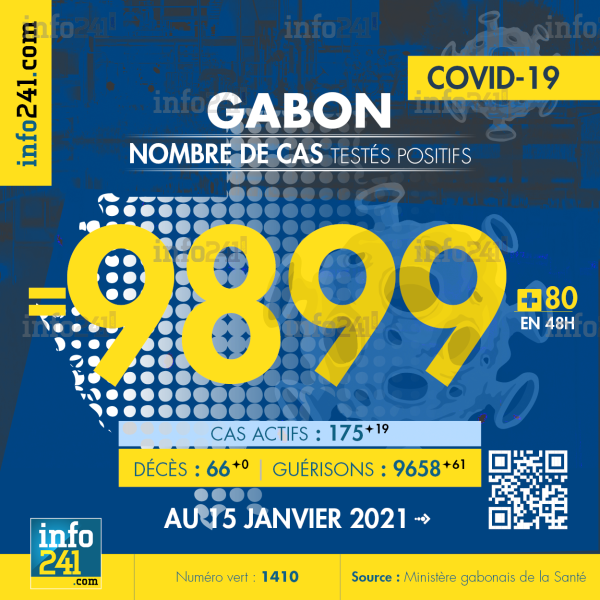 Ce qui porte le bilan à 9 899 cas confirmés, 66 décès et 9 658 guérisons. Le Gabon compte actuellement 175(+19) cas actifs de la pandémie officiellement déclarés. Parmi eux 14(+6) patients hospitalisés dans le pays dont 10(+2) en réanimation.