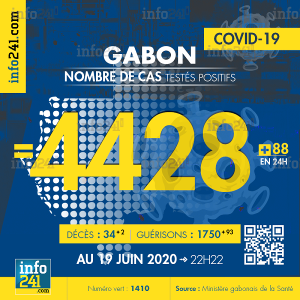 Bilan épidémiologique du Gabon au 19 juin 2020 : 88 nouveaux cas enregistrés en 24h dans l’Estuaire (67 cas), le Haut-Ogooué (16 cas) et le Woleu-Ntem (5 cas). Il y a eu 2 nouveaux décès à Lambaréné et Franceville et 93 nouvelles guérisons. Ce qui porte le bilan à 4 428 cas confirmés, 34 décès et 1 750 guérisons. Il y a actuellement 102(-6) patients hospitalisés dans le pays dont 9 (-6) en réanimation.