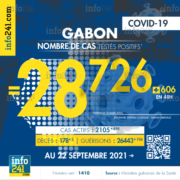 Bilan épidémiologique du Gabon au 22 septembre 2021 : 606 nouveaux cas enregistrés en 48h dans l’Estuaire (538 cas), l’Ogooué-Maritime (25 cas), le Haut-Ogooué (15 cas), le Woleu-Ntem (11 cas), le Moyen-Ogooué (9 cas) et l’Ogooué-Lolo (8 cas). Il y a eu 2 nouveaux décès et 106 nouvelles guérisons.