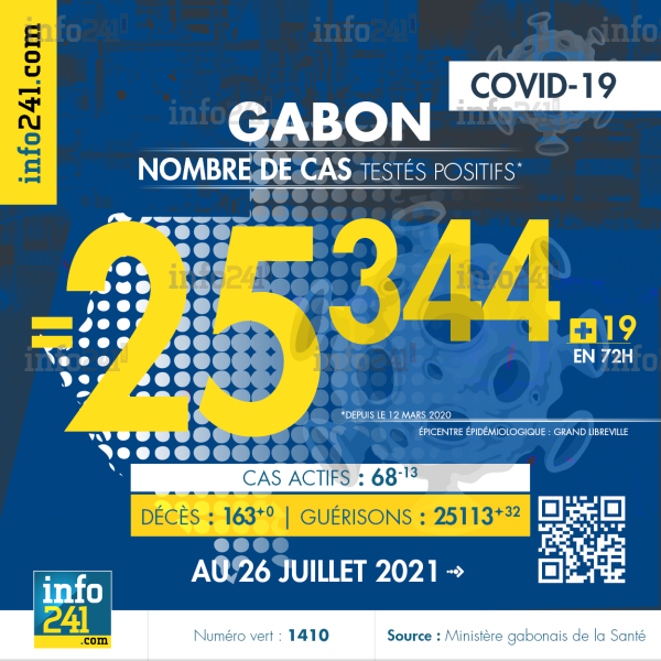 Bilan épidémiologique du Gabon au 26 juillet 2021 : 19 nouveaux cas enregistrés en 72h dans l’Estuaire (17 cas), l’Ogooué-Ivindo (1 cas) et l’Ogooué-Maritime (1 cas). Il y a eu aucun nouveau décès et 32 nouvelles guérisons.