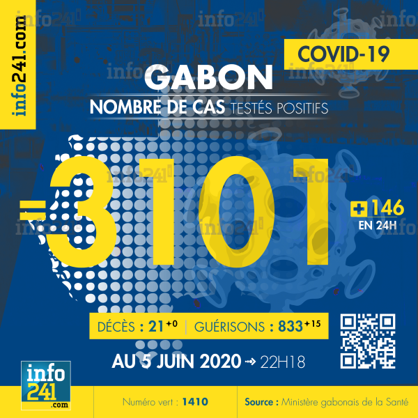 Coronavirus : le bilan épidémiologique du Gabon au 5 juin 2020 : 146 nouveaux cas enregistrés en 24h dans l’Estuaire (128 cas) et le Woleu-Ntem (18 cas). Il y a eu aucun nouveau décès et 15 nouvelles guérisons. Ce qui porte le bilan à 3 101 cas confirmés, 21 décès et 833 guérisons. Il y a actuellement 91(-8) patients hospitalisés dans le pays dont 13 (-2) en réanimation.