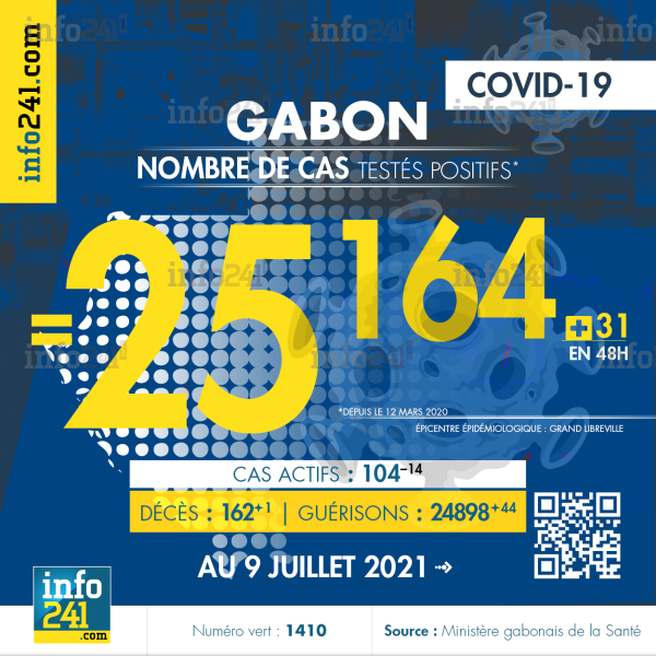 Ce qui porte le bilan à 25 164 cas confirmés, 162 décès et 24 898 guérisons. Le Gabon compte actuellement 104(-14) cas actifs de la pandémie officiellement déclarés. Parmi eux 21 (+5) patients hospitalisés dans le pays dont 11 (+2) en réanimation.