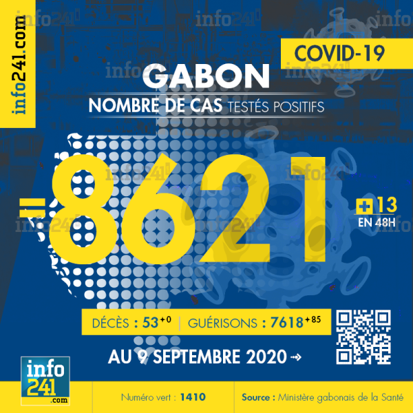 Bilan épidémiologique du Gabon au 9 septembre 2020 : 13 nouveaux cas enregistrés en 48h dans l’Estuaire (9 cas), l’Ogooué-Maritime (3 cas) et le Haut-Ogooué (1 cas). Il y a eu aucun nouveau décès et 85 nouvelles guérisons.