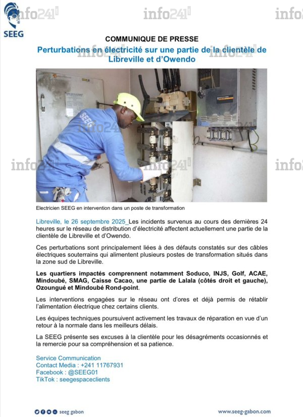 La SEEG indique que ses équipes techniques ont déjà lancé des interventions d’urgence, ce qui a permis de rétablir l’alimentation électrique dans certains secteurs. Les travaux de réparation se poursuivent afin de garantir un retour complet à la normale dans les plus brefs délais.