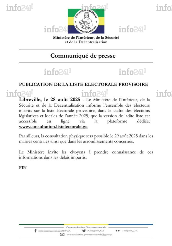 Le ministère de l’Intérieur, de la Sécurité et de la Décentralisation a annoncé ce jeudi 28 août dans un communiqué parvenu à la rédaction d’Info241, la mise à disposition de la liste électorale provisoire dans le cadre des scrutins législatifs et locaux prévus en 2025. « La version de ladite liste est accessible en ligne via la plateforme dédiée : https://www.consultation.listelectorale.ga », précise le texte.