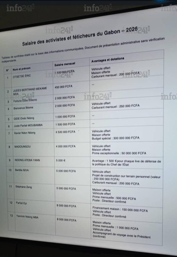 Logement : Des « Maisons offertes » sont mentionnées pour Éric Otsetse, Xavier Ndong Ndong, Alfred Madoungou, Stéphane Zeng ou encore Yannick Ndong Mba. Pour Parfait Eyi, l’État financerait sa maison à hauteur de 150 millions de FCFA.