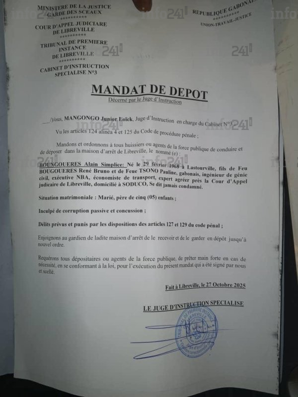 Selon son mandat de dépôt qui a fuité, Alain Simplice Boungoueres a été inculpé pour corruption passive et concussion, deux délits prévus et réprimés par les articles 127 et 129 du Code pénal gabonais. Le mandat de dépôt a été émis par le juge d’instruction Junior Loïck Mamgongo, du cabinet n°3 du tribunal de première instance de Libreville, qui a ordonné au gardien de la maison d’arrêt de le recevoir et de le garder en détention jusqu’à nouvel ordre.