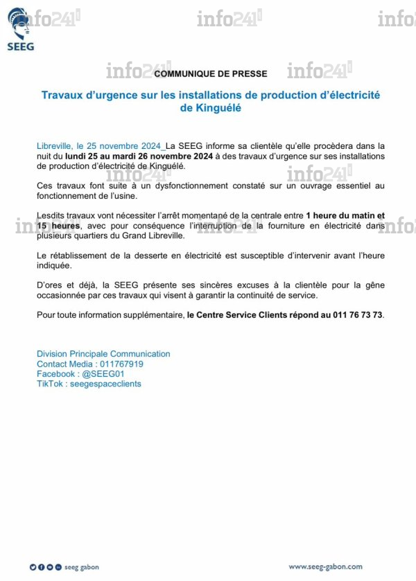 Grand Libreville : la SEEG annonce des coupures d’électricité pour des travaux d’urgence à Kinguélé © 2024 D.R./Info241