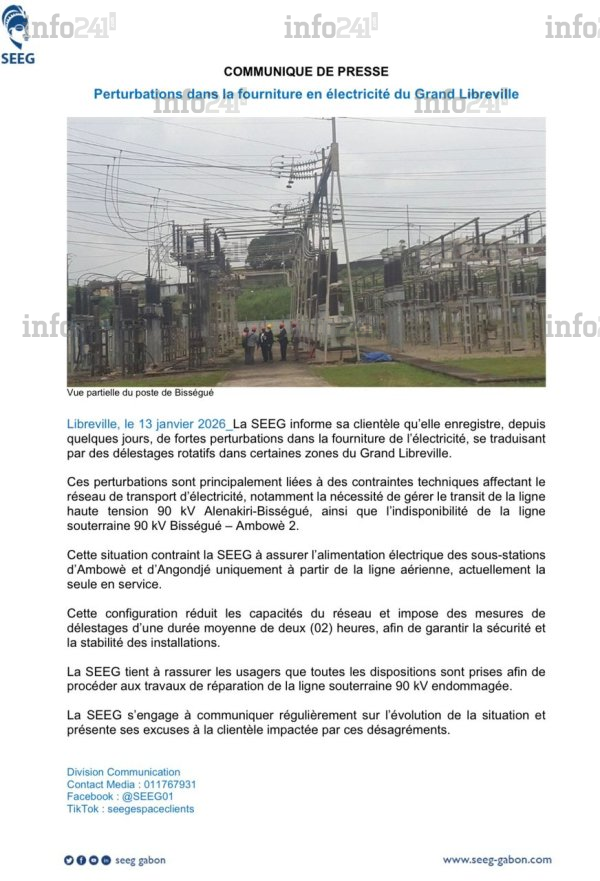 Face aux coupures d’électricité récurrentes constatées ces derniers jours par les populations, la Société d’énergie et d’eau du Gabon (SEEG) est enfin sortie de son silence ce mardi 13 janvier. Dans un communiqué parvenu à la rédaction d’Info241, l’entreprise publique d’énergie explique ces perturbations par des contraintes techniques sur son réseau de transport et annonce la mise en place de délestages rotatifs d’une durée moyenne de deux heures dans le Grand Libreville.
