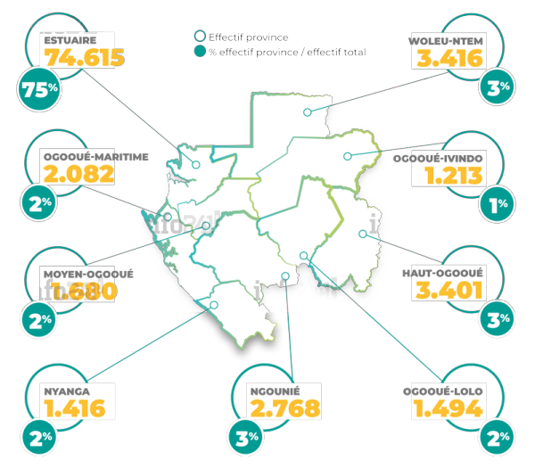 l’appareil d’Etat gabonais. Après l’Estuaire, les provinces du Haut-Ogooué et du Woleu-Ntem accueillent également le plus grand nombre d’agents publics.