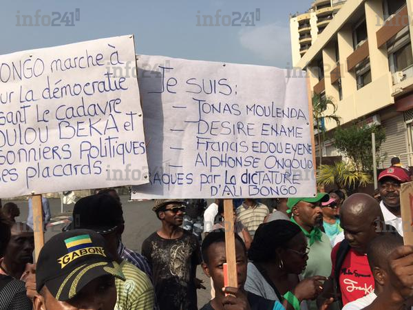 « Nous sommes Charlie », pouvait-on lire sur un petit carton brandit à côté des pancartes et banderoles hostiles au président gabonais Ali Bongo Ondimba.