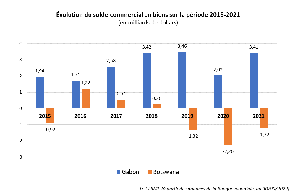 Ce processus de diversification a également contribué à accroître l’excèdent commercial du pays, passé de 1,9 à 3,4 milliards de dollars entre 2015 et 2021 (toujours selon la Banque mondiale), alors que le Botswana peine désormais à enregistrer un solde commercial positif, le pays étant en déficit depuis 2019 (et l’ayant aussi été en 2015). Sur la période de sept années allant de 2015 à 2021, le Gabon a ainsi réalisé un excédent commercial de 2,6 Mds de dollars en moyenne annuelle, contre un déficit de 0,5 Md pour le Botswana. Les récentes mesures audacieuses prises pour la promotion de la production alimentaire locale, ou encore le doublement prochain de la part de la production locale de gaz butane (devant être protée à 40 % d’ici deux ans, en 2023), seront également de nature à accroître les excédents commerciaux de pays, à travers la réduction significative des importations en la matière. Au passage, il est à noter que la Chine est désormais le premier partenaire commercial du Gabon, dont elle a représenté 27 % du commerce extérieur en 2021 (et absorbé 33 % des exportations). Elle est suivie par la France, qui arrive en deuxième position avec une part de seulement 10 % du commerce extérieur, comme en 2020.
