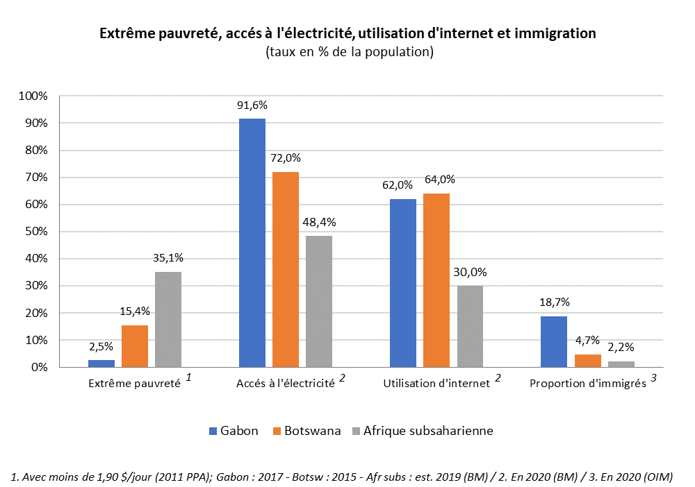 Les grandes avancées réalisées en matière de diversification, de réformes et plus globalement en matière de bonne gouvernance, ont ainsi permis au pays de connaître d’importants progrès économiques et sociaux au cours de la dernière décennie. À titre d’exemple, et dans le domaine de la santé, le taux de mortalité infantile est passé au-dessous de celui du Botswana au cours de la dernière décennie, pour s’établir à 31 décès pour 1 000 naissances vivantes en 2020 (et 36 pour le Botswana). Ce taux est largement inférieur à la moyenne de l’Afrique subsaharienne (50 ‰), se rapproche de celui de l’Afrique du Sud (26 ‰), et est très éloigné de celui de pays comme le Nigeria (72 ‰, et quatrième taux le plus élevé du continent, selon la Banque mondiale). Par ailleurs, le pays se distingue sur la scène internationale en étant l’un des deux seuls pays du continent à disposer d’un laboratoire de type P4, avec l’Afrique du Sud (laboratoire habilité à manipuler les virus les plus dangereux de la planète, comme le virus Ebola). Toujours dans le registre de la santé, il est à noter que la Gabon se distingue également par son assez bonne maîtrise de la progression du VIH (ou Sida), avec un taux de prévalence de 3 % de la population âgée de 15 à 49 ans en 2021, contre 19 % au Botswana qui affiche le troisième taux le plus élevé au monde, juste devant l’Afrique du Sud.