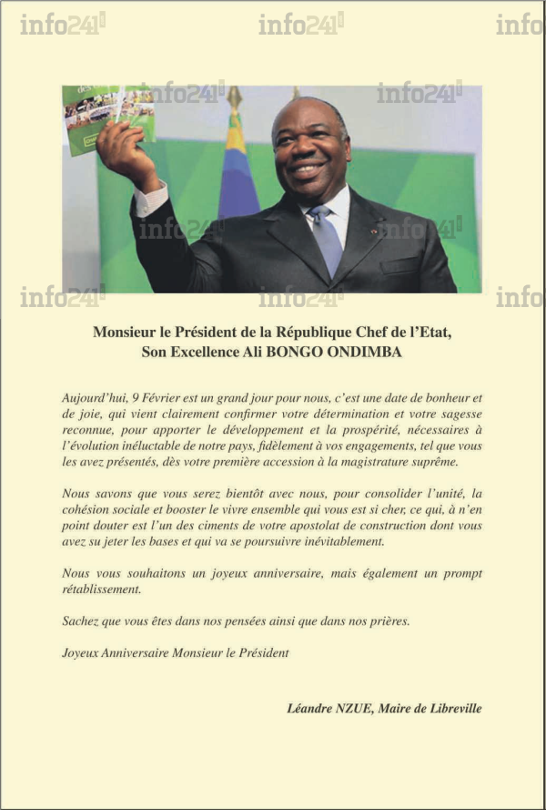 Il est pourtant de notoriété publique qu’Ali Bongo est en exil médical au Maroc depuis des mois, loin du Gabon qu’il dirige désormais depuis le Maroc. Cela n’a pas empêché visiblement le nouveau maire de Libreville, Léandre Nzue, de s’adresser à Ali Bongo, l’homme qui lui a permis de devenir enfin maire de Libreville le 3 février. Pour remercier son bienfaiteur, quoi de mieux que de lui souhaiter un joyeux anniversaire en s’offrant une page de pub dans le quotidien pro-gouvernemental qui ne parait pourtant pas au Maroc !