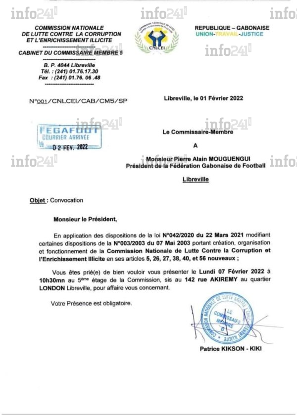 Celui-ci est prié de se présenter ce lundi « 07 Février 2022 à 10h30mn au 5ème étage de la Commission, sis au 142 rue AKIREMY au quartier LONDON Libreville, pour affaire vous concernant », conclu la convocation datée du 1er février et dont la Fegafoot n’a accusé réception que ce mercredi. Affaire à suivre...
