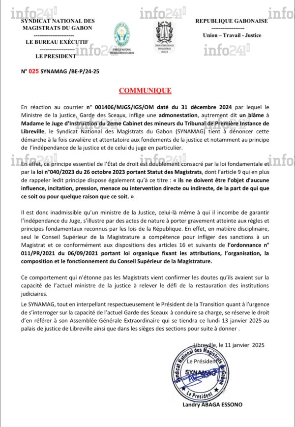 Le Syndicat national des magistrats du Gabon (SYNAMAG) a lancé une offensive contre le ministre de la Justice, Garde des Sceaux, Paul-Marie Gondjout qu’il accuse d’avoir bafoué les principes fondamentaux de l’indépendance de la magistrature. Dans un communiqué publié le 11 janvier, signé par son président Landry Abaga Essono, le SYNAMAG s’insurge contre une admonestation adressée à une juge d’instruction du Tribunal de Première Instance de Libreville. Cette sanction, qualifiée de « cavalière  », est perçue comme une atteinte grave aux fondements de l’État de droit.