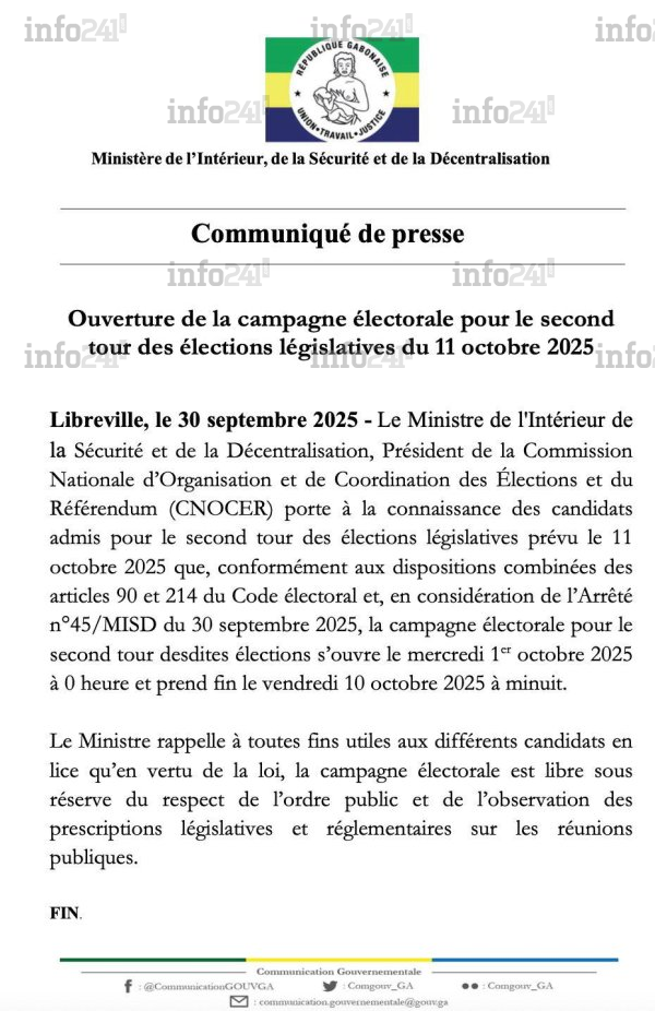 Le ministère gabonais de l’Intérieur a confirmé, mardi soir, l’ouverture de la campagne électorale pour le second tour des élections législatives du 11 octobre prochain. Dans un communiqué officiel parvenu à Info241, Hermann Immongault, ministre de l’Intérieur, de la Sécurité et de la Décentralisation, a annoncé que « la campagne électorale pour le second tour desdites élections s’ouvre le mercredi 1er octobre 2025 à 0 heure et prend fin le vendredi 10 octobre 2025 à minuit ».