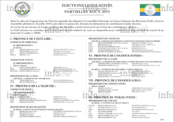 Les législatives partielles qui auraient dû être organisé au plus tard le 15 avril dernier par le CGE se tiendront finalement les 10 et 31 août. Désormais au pas de course, le CGE qui avait fixé au 24 juillet le délai de dépôt de candidatures, a publié samedi la liste des candidats retenus pour ce scrutin. Pour le premier tour de ces législatives partielles, ils seront 39 candidats à se bousculer au portillon de l’Assemblée nationale.