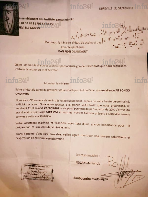 La demande de sponsoring de la veillée bwiti reçue par le directeur cabinet du ministre Otandault le 14 décembre