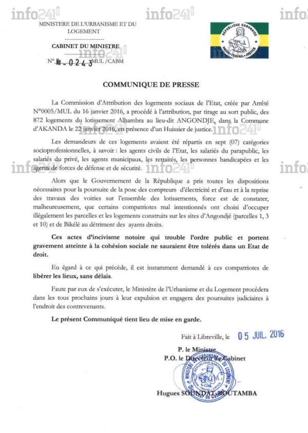 Mardi, soit 5 jours plus tard, le ministère de l’Urbanisme et du logement a sommé les squatteurs de libérer les lieux sans délais avant de brandir le spectre de poursuites judiciaires. Les squatteurs occupent ainsi certaines parcelles à Bikelé et les logements sociaux d’Agondjé.