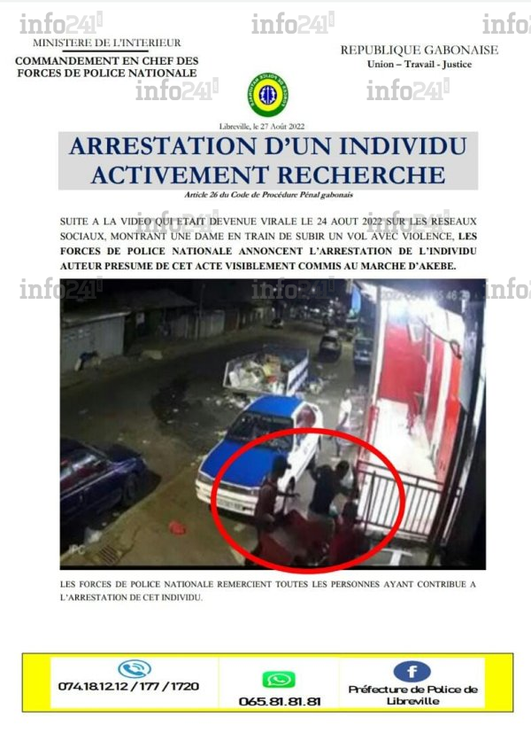 Le bandit a pu être identifié grâce à un avis de recherche aussitôt contre le malfrat. Activement recherché depuis le 24 août dernier grâce à cette vidéo qui a créé l’indignation sur les réseaux sociaux, l’individu en cavale a heureusement été arrêté. C’est du moins ce que précise l’avis d’arrestation publié par la police nationale. « Les forces de police nationale informe l’arrestation de l’individu auteur présumé de cet acte visiblement commis au marché d’Akébé », a indiqué ce 27 août dernier le commandement en chef des forces de police.