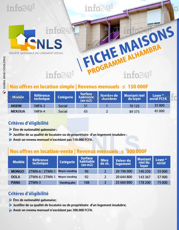 Le Gabon accuse un déficit de 200.000 logements. Le programme Alhambra lancé le 8 décembre 2014 comprend 872 logements d’une à deux chambres. Les locations devraient théoriquement se situer entre 35.000 F.CFA et 45.000 F.CFA. Il présente également l’avantage aux demandeurs de ne pas nécessiter de crédit bancaire pour y accéder.