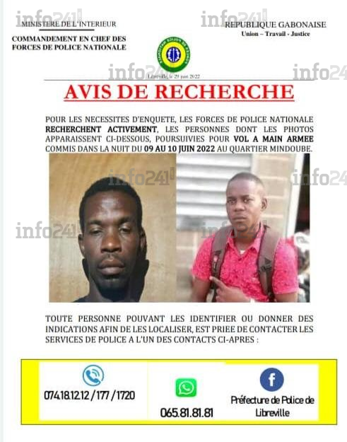« Pour les nécessités d’enquête, les forces de police nationale recherchent activement les personnes dont les photos apparaissent ci-dessous. Ils sont poursuivis pour vol à main armée commis dans la nuit du 09 au 10 juin dernier au quartier Mindoubé », précise la police gabonaise dans son avis de recherche publié notamment sur Facebook.