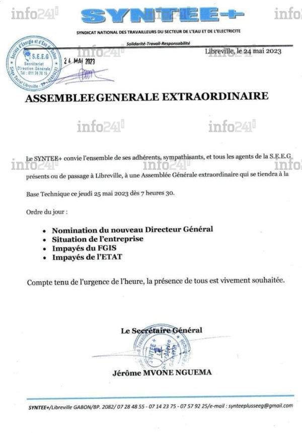 Dans son appel à une assemblée générale extraordinaire ce jeudi matin, le syndicat des agents entend ratisser large en rassemblant l’ensemble des employés. « Le SYNTEE+ convie l’ensemble de ses adhérents, sympathisants et tous les agents de la S.E.E.G présents ou de passage à Libreville, à une Assemblée Générale extraordinaire qui se tiendra à la Base Technique ce jeudi 25 mai 2023 dès 7 heures 30 », indique la note parvenue ce mercredi à la rédaction d’Info241.
