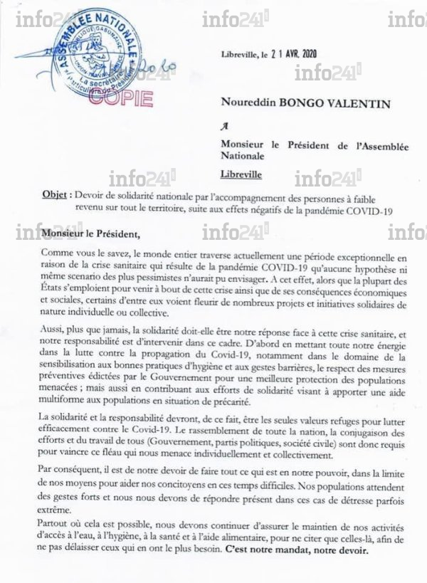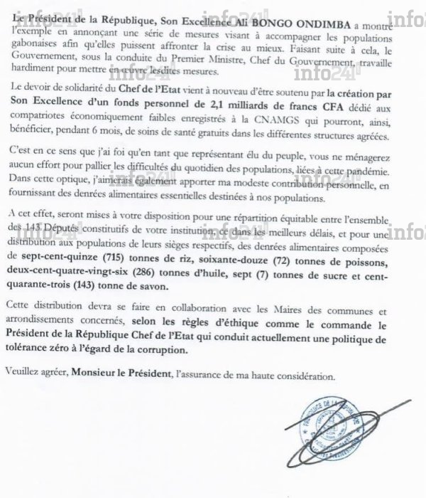 Dans son courrier adressé au président de l’Assemblée nationale Faustin Boukoubi qu’Info241 a obtenu copie, Noureddin Valentin instruit ainsi le patron de la Représentation nationale à repartir de façon équitable « entre les 143 députés constitutifs de son institution, ce dans les meilleurs délais, pour une distribution aux populations de leurs sièges respectifs » de son don en denrées alimentaires. Un courrier de même nature, a ainsi été également ce mardi envoyé aux différents maires du Gabon.