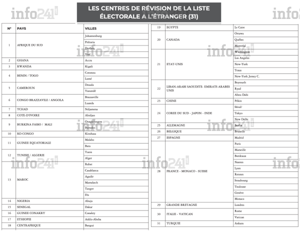 Voici la liste des pays et centre de vote autorisés à voter ce samedi 26 aout à l’étranger conformément à ce décret exceptionnel :