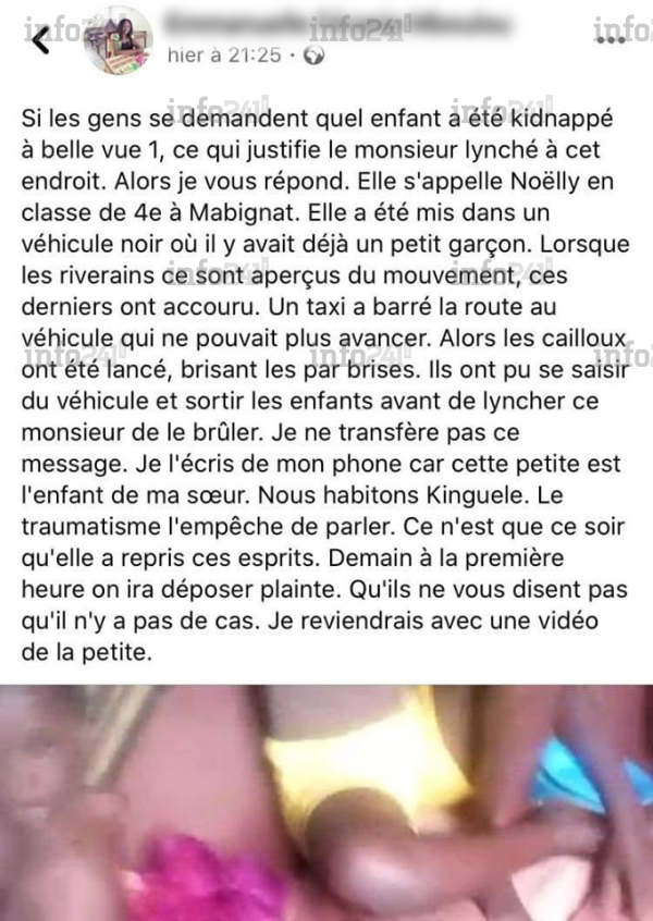 Alerté par ce « kidnapping » qui venait de se dérouler sous leurs yeux, les riverains ont tenté d’arraisonner le véhicule de Stanislas Mba Ngoua. Ce serait un autre véhicule à usage de taxi qui aurait finalement barré la route au kidnappeur présumé. Là débutera son lynchage. « Alors les cailloux ont été lancé, brisant les par brises. Ils ont pu se saisir du véhicule et sortir les enfants avant de lyncher ce monsieur de le brûler », raconte cette internaute qui joint à son témoignage une vidéo où l’on peut peut voir une jeune fille tétanisé.