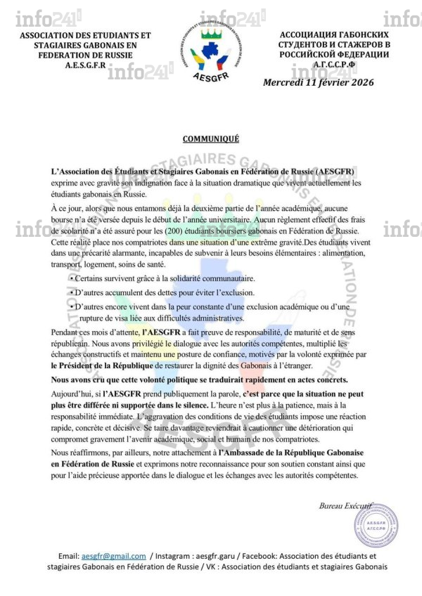 La situation des étudiants gabonais en Fédération de Russie atteint un seuil critique de précarité. Dans un communiqué officiel parvenu à la rédaction d’Info241 ce jeudi, l’Association des étudiants et stagiaires gabonais en fédération de Russie (AESGFR) exprime avec une profonde gravité son indignation face à la détresse de 200 boursiers. Alors que l’année académique entame sa seconde phase, ces jeunes compatriotes se retrouvent abandonnés sans aucun soutien financier de la part de l’État, une situation qualifiée d’une « extrême gravité » par leurs représentants.