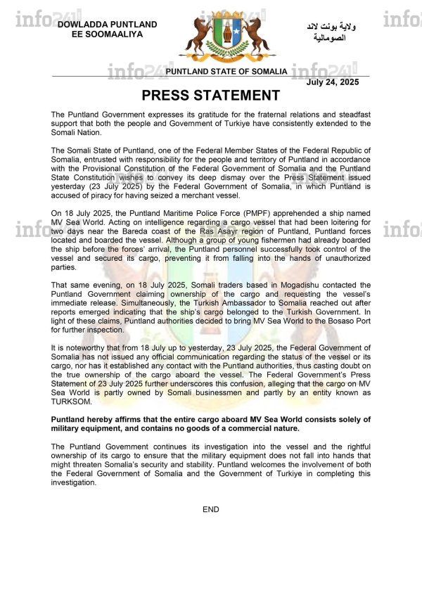 Somalie : Le Puntland intercepte un navire chargé de matériel militaire destiné à la Turksom © 2025 D.R./Info241