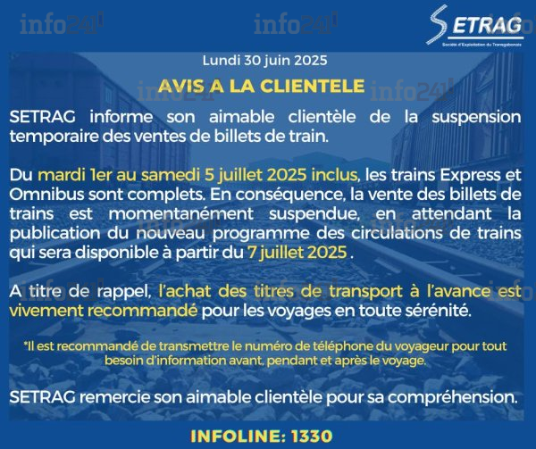 En attendant la publication du nouveau programme de circulation, prévue pour le 7 juillet 2025, la vente de billets reste donc momentanément interrompue. La société recommande vivement à sa clientèle d’acheter ses titres de transport à l’avance pour éviter tout désagrément, tout en rappelant l’importance de transmettre le numéro de téléphone du voyageur pour un meilleur suivi.