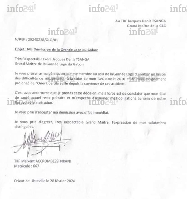 Dans sa lettre de démission, qui a fuité aujourd’hui sur la toile, le "Très Respectable Frère" Maixent Accrombessi Nkani évoque comme raison à son départ ses problèmes de santé survenus en août 2016. En effet, tout comme Ali Bongo deux ans plus tard, son ancien bras droit a également été victime d’un Accident vasculaire cérébral (AVC) dont les lourdes séquelles avaient été soigneusement bien gardées secrètes.