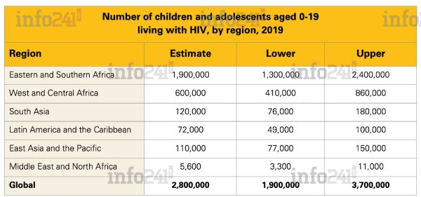 Estimations par région des jeunes de 0 à 19 ans vivant avec le VIH en 2019 (ONUSida)