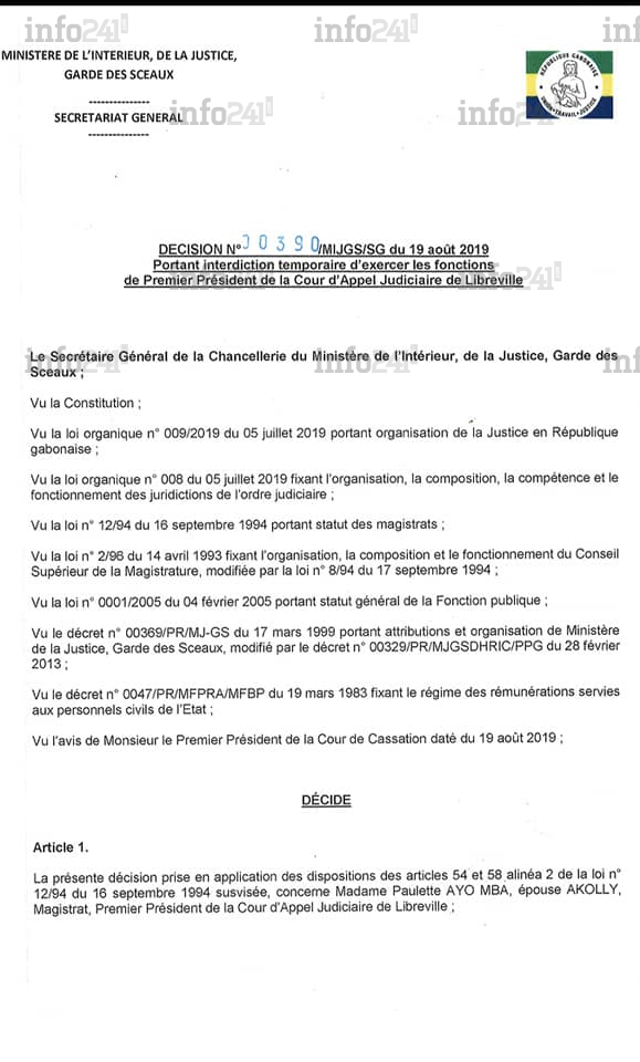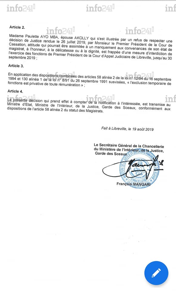 Pour le ministère de la Justice à l’origine de cette décision, la juge « s’est illustrée par un refus de respecter une décision de justice rendue le 26 juillet 2019 par monsieur le président de la Cour de cassation ». Une faute qui vaut à l’intéressée une exclusion temporaire de plus de 40 jours des effectifs de la justice gabonaise avec pour conséquence, le non-paiement de son salaire de septembre prochain.