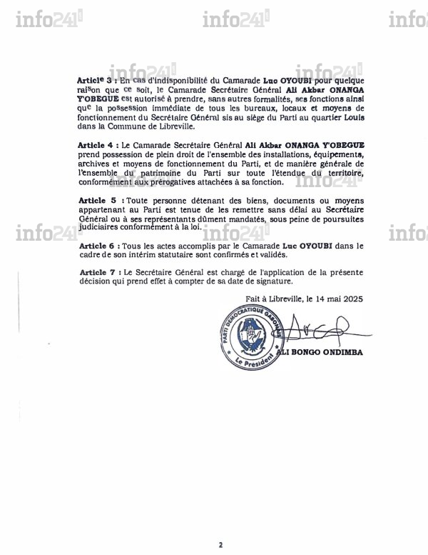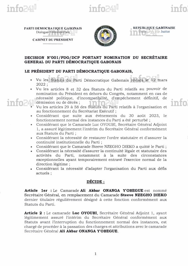 Selon un post publié par Ali Akbar Onanga Y’Obegue lui-même, Ali Bongo lui aurait confié la direction du PDG et ordonné la prise de contrôle de tous les biens et locaux du parti dès le 14 mai, avant de quitter le Gabon avec sa famille dont sa femme et son fils ont obtenu à la surprise générale une remise en liberté provisoire. Mais ce document, dévoilé deux mois après sa rédaction et à peine 24 heures après l’exclusion des membres du clan dissident, suscite d’innombrables interrogations sur son authenticité et ses motivations politiques.