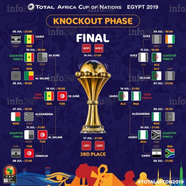 Les demi-finales de la CAN 2019 se disputeront ce dimanche avec deux rencontres au sommet. Pour une place en finale, le Sénégal et la Tunisie devront s’affronter en première heure à 17h00 (heure de Libreville) au stade du 30 Juin du Caire. Suivra ensuite, le choc Algérie vs Nigeria à 20h00 (heure de Libreville) au stade international du Caire.