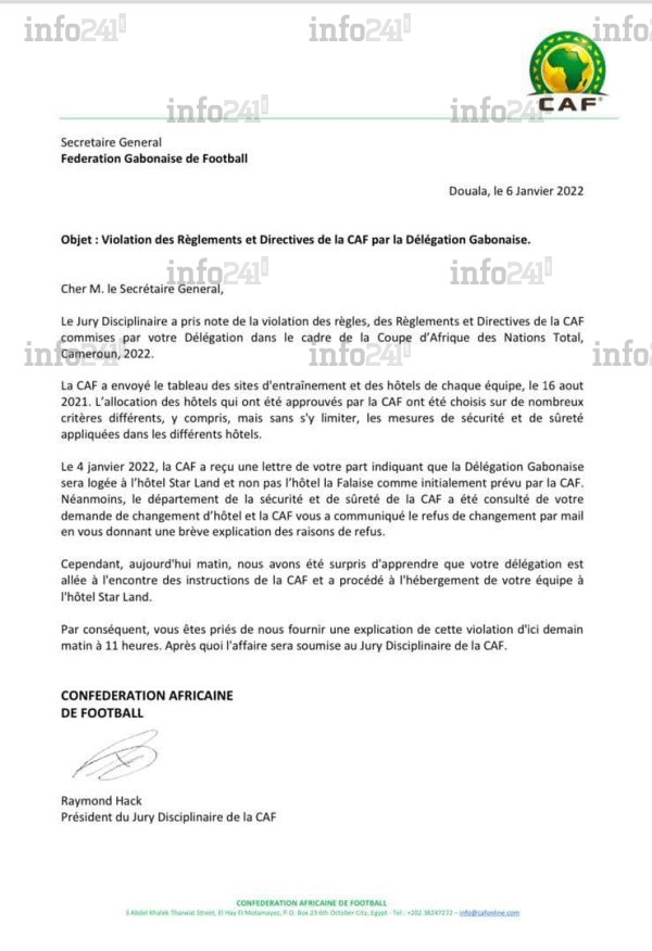 Dans son courrier d’incident, Raymond Hack le président du Jury disciplinaire rappelle que la CAF avait depuis le 16 aout 2021 dernier, envoyé le tableau des sites d’entraînement et des hôtels de chaque équipe. C’est finalement ce mardi que la délégation gabonaise aurait changé d’avis. « Le 4 janvier 2022, la CAF a reçu une lettre de votre part indiquant que la Délégation Gabonaise sera logée à l’hôtel Star Land et non pas l’hôtel la Falaise comme Initialement prévu par la CAF », souligne le courrier officiel adressé au Gabon.
