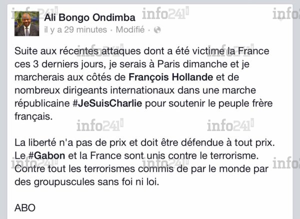 Pour le président gabonais, « la liberté n’a pas de prix et doit être défendue à tout prix. Le Gabon et la France sont unis contre le terrorisme. Contre tout les terrorismes commis de par le monde par des groupuscules sans foi ni loi » a-t-il indiqué initialement sur sa page facebook avant de se rétracter en : « la liberté n’a pas de prix. Le #Gabon et la France sont unis contre le terrorisme ».