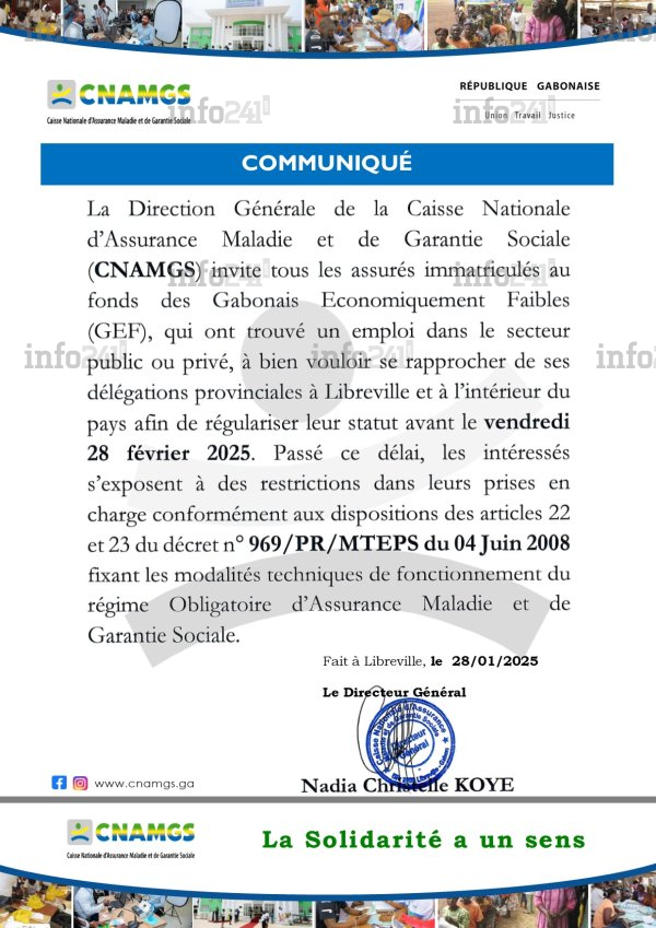 Selon le communiqué signé de la DG Nadia Christelle Koye, « les assurés immatriculés au fonds des Gabonais Économiquement Faibles (GEF), qui ont trouvé un emploi dans le secteur public ou privé, doivent se rapprocher des délégations provinciales à Libreville et à l’intérieur du pays afin de régulariser leur statut ». Passé ce délai, ceux qui ne se seront pas signalés s’exposent à des « restrictions dans leurs prises en charge », en application des articles 22 et 23 du décret n° 969/PR/MTEPS du 04 juin 2008.