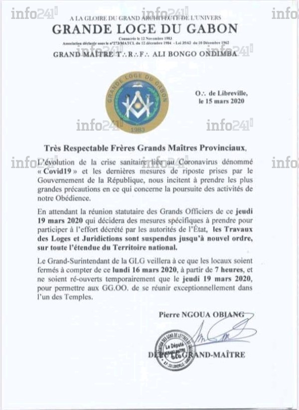 Pour coller à cette crise, la Grande loge du Gabon décide qu’en "attendant la réunion statutaire des Grands Officiers de ce jeudi 19 mars 2020 qui décidera des mesures spécifiques à prendre pour participer à l’effort décrété par les autorités de l’Etat, les Travaux des Loges et Juridictions sont suspendus jusqu’à nouvel ordre, sur toute l’étendue Territoire national". Selon ce communiqué parvenu à la rédaction d’Info241 ce dimanche, c’est le Grand-Surintendant de la GLG qui veillera à l’application de la fermeture des locaux ce lundi 16 mars 2020, à partir de 7 heures.