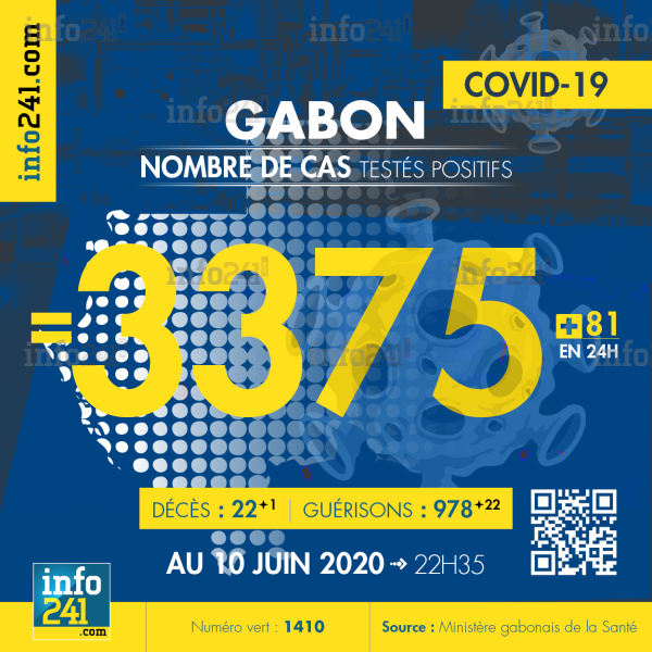 Le bilan de l’épidémie de coronavirus au Gabon au 10 juin : 81 nouveaux cas enregistrés en 24h dans l’Estuaire (60 cas), le Haut-Ogooué (15 cas), l’Ogooué-Lolo (2 cas) et le Moyen-Ogooué (4 cas). Il y a eu un nouveau décès à Moanda et 22 nouvelles guérisons. Ce qui porte le bilan à 3 375 cas confirmés, 22 décès et 978 guérisons. Il y a actuellement 77(-10) patients hospitalisés dans le pays dont 17 (+2) en réanimation.