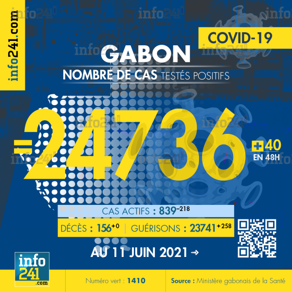 Ce qui porte le bilan à 24 736 cas confirmés, 156 décès et 23 741 guérisons. Le Gabon compte actuellement 839(-218) cas actifs de la pandémie officiellement déclarés. Parmi eux 33(-3) patients hospitalisés dans le pays dont 17(+1) en réanimation.