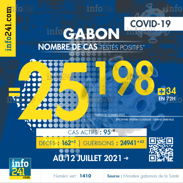 Bilan épidémiologique du Gabon au 12 juillet 2021 : 34 nouveaux cas enregistrés en 72h dans l’Estuaire (27 cas), l’Ogooué-Maritime (3 cas), l’Ogooué-Ivindo (2 cas) et le Woleu-Ntem (2 cas). Il y a eu aucun nouveau décès et 43 nouvelles guérisons.